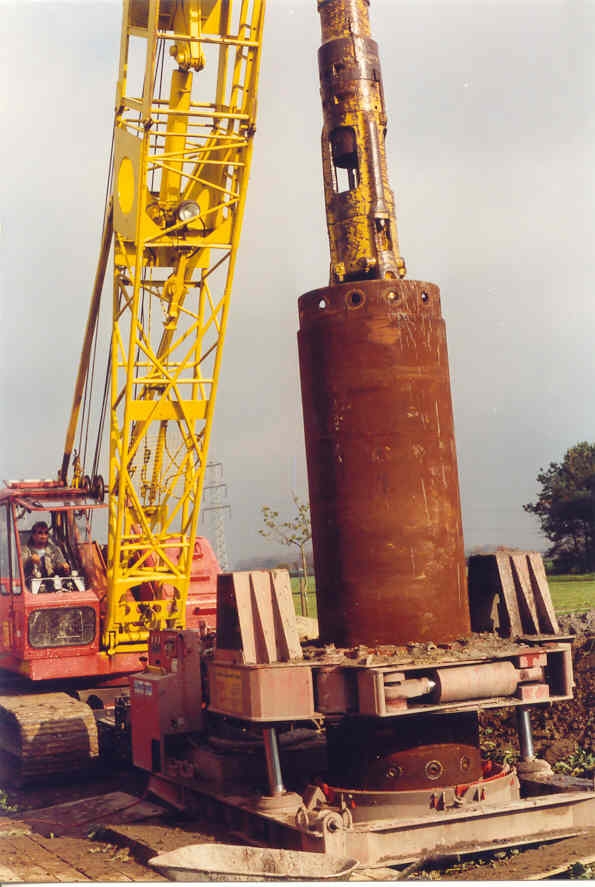 The hydr. operated NORDMEYER casing rotary units series HV 600 - HV 1000 - HV 1080 - HV 1200 are add-on units for dredgers for water supply or draining wells, soil investigation in dumps, for piling or similar drilling tasks in soft to medium hard formations. Their solid design and their relatively small weight enable easy transportation by truck granting a quick move from site to site at low cost. The casing unit is easily and reliably fixed to the dredger by stable holding plates and guiding rails absorbing the torque of the shocking movement. During drilling the upper part of the dredger can fully use the complete slewing radius of 360 .